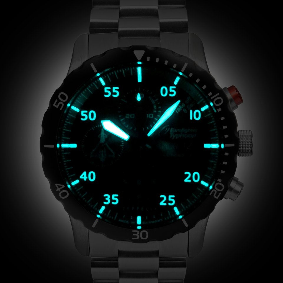 Dark blue dial with white, night-glow numerals/indices, luminous hands